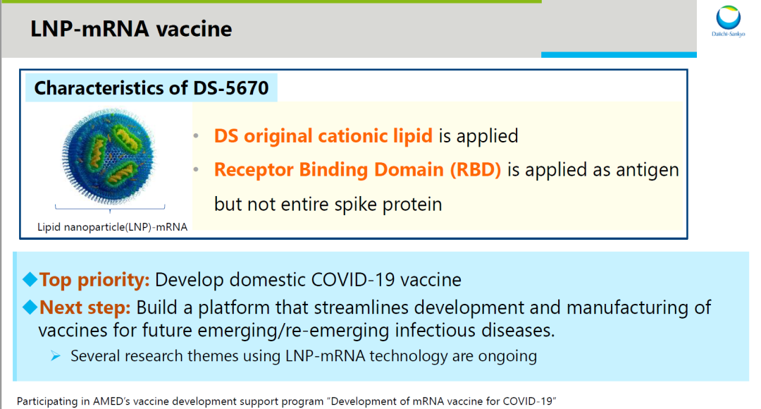 DS-5670是一款mRNA疫苗,使用了第一三共发现的新型核酸传递技术,旨在产生针对新型冠状病毒刺突蛋白受体结合域(RBD)的抗体,从而对COVID-19产生良好的预防作用和安全性。第一三共致力于在2-8°C冷链下分发mRNA疫苗。
