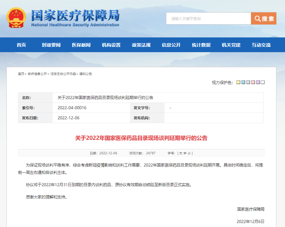 12月6日,国家医保局官方发布消息,为保证现场谈判平稳有序,综合考虑新冠疫情影响和谈判工作需要,2022年国家医保药品目录现场谈判延期开展。具体时间确定后,将提前一周左右通知各谈判主体。