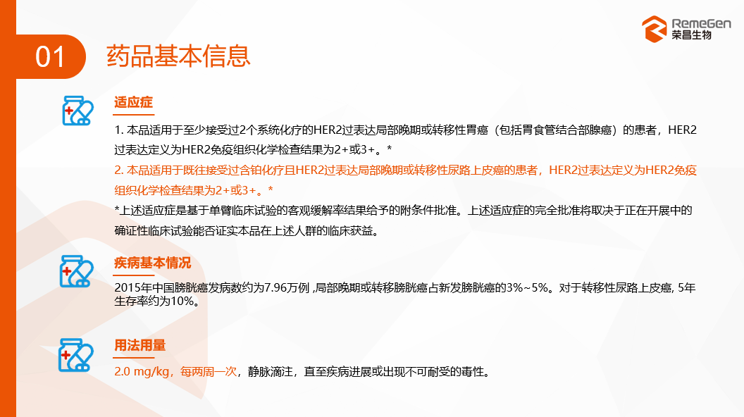 本次医保谈判维迪西妥单抗拟新增适应证为用于既往接受过含铂化疗且HER2过表达局部晚期或转移性尿路上皮癌的患者,该适应证于2021年12月31日获NMPA附条件批准。