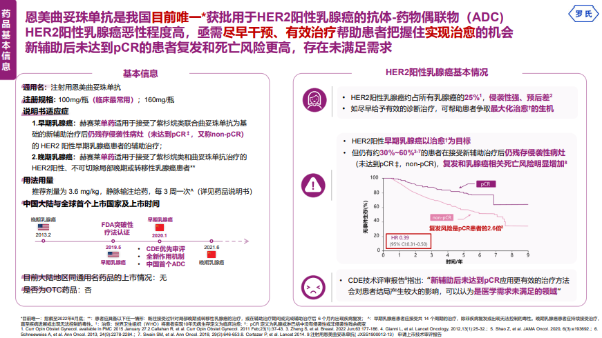 罗氏旗下注射用恩美曲妥珠单抗(商品名:Kadcyla,赫赛莱)于2020年1月获NMPA批准上市,单药适用于接受了紫杉烷类联合曲妥珠单抗为基础的新辅助治疗后仍残存侵袭性病灶的HER2阳性早期乳腺癌患者的辅助治疗,是国内首个获批的ADC。