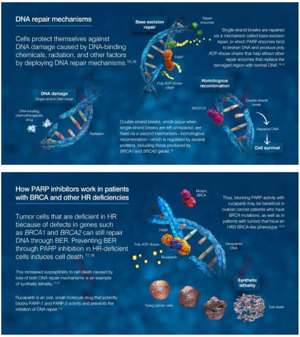 Clovis Oncology公司的新药Rubraca是一种靶向聚ADP-核糖聚合酶(PARP)的抑制剂,可阻断参与修复受损DNA的PARP酶活性。当PARP的功能得到抑制,那些同时具有受损BRCA基因的癌细胞DNA不太可能得到修复,于是可导致癌细胞死亡,并可能减缓或停止肿瘤生长。