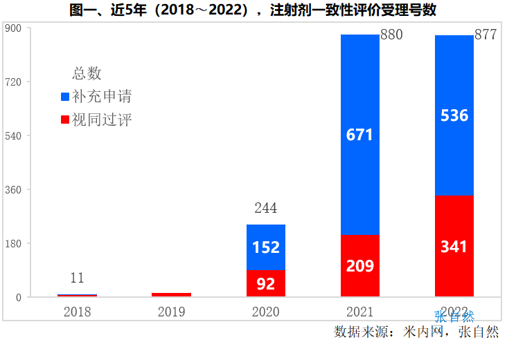 在2020年5月14日《关于开展化学药品注射剂仿制药质量和疗效一致性评价工作的公告》(注射剂一致性评价规则)发布前,注射剂都是以视同过评的方式过评,数量很少,评价规则出台后,大量注射剂通过补充申请的方式申报并过评,2020年规则出台当年即有244个注射剂受理号过评,2021年猛增2.6倍,有880个受理号过评,刚刚过去的2022年又有877个受理号过评,与上年(2021年)持平(详见图一)。