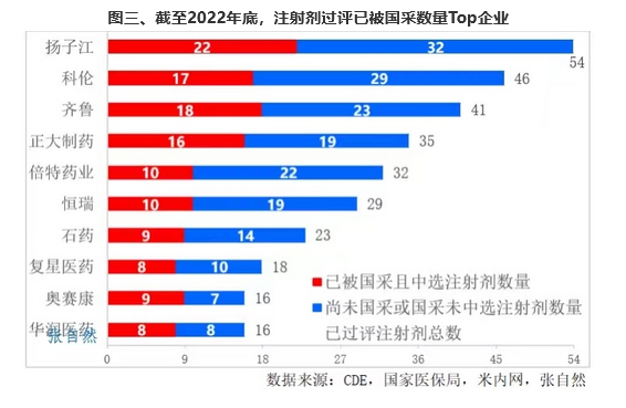 截至2022年底,过评注射剂数量最多的是扬子江药业,共有54个注射剂过评,其中,22个已被国采并中选,剩余32个将参与第八批及以后的集采。科伦和齐鲁也都有40个以上注射剂过评,分别为46个和41个,其中,分别有17个和18个已被国采并中选。