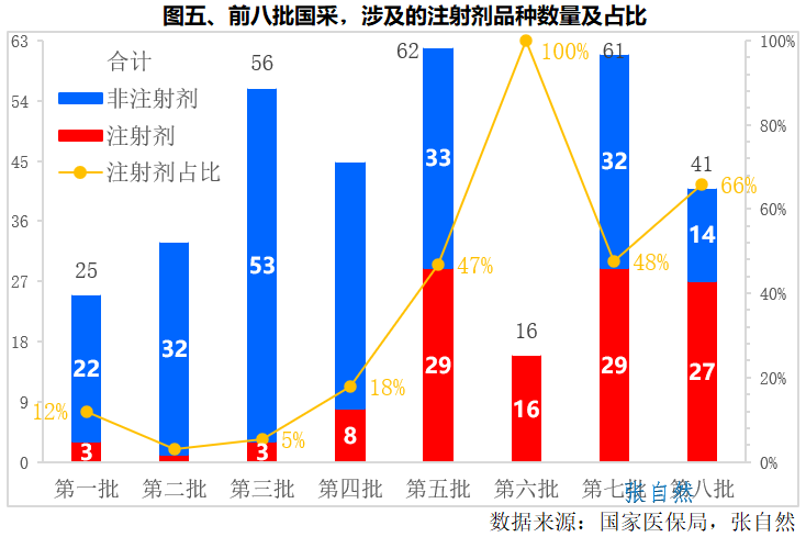 第八批国采共有27个注射剂,占第八批国采药品总数41个的66%,创历次国采(除第六批外)之最(详见图五)。