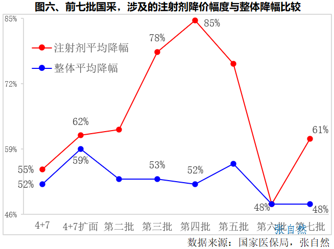 因注射剂主要在院内销售,院内市场是注射剂的必争之地,所以集采时注射剂要比口服等非注射剂竞争更加激烈。如图六所示,往期国采注射剂降价幅度都高于整体平均降幅,差距少则3个点(4+7),多则33个百分点(第四批)。