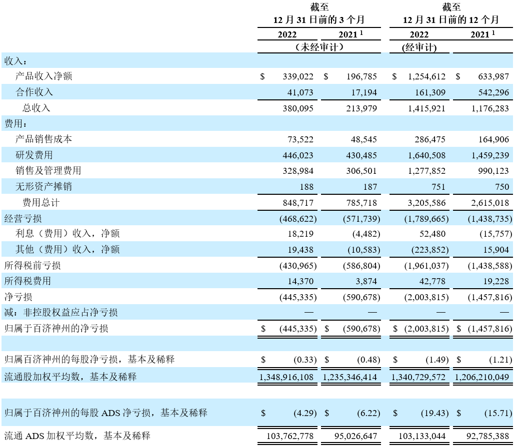 净亏损:2022年第四季度的净亏损为4.453亿美元,即每股亏损0.33美元,每股美国存托股份(ADS)亏损4.29美元;相比较,上一年同期净亏损为5.907亿美元,即每股亏损0.48美元,每股ADS亏损6.22美元。净亏损的减少主要是由于产品收入的增长超过了经营费用的增长,从而提高了经营杠杆。公司预计在2023年将继续保持这一趋势。2022年全年的净亏损为20亿美元,即每股亏损1.49美元,每股ADS亏损19.43美元;相比较,上一年同期净亏损为15亿美元,即每股亏损1.21美元,每股ADS亏损15.71美元。2022年的净亏损包含非经营性费用2.239亿美元,该部分非经营性费用主要来自于美元走强,以及按美元计价子公司所持外币货币价值重估所录得的汇兑损失。得益于对与诺华就百泽安®达成的合作协议进行收入确认的时间点,2021年全年的净亏损被部分抵销。在目前已收到的6.5亿美元预付款中,公司于2021年全年确认了4.846亿美元。