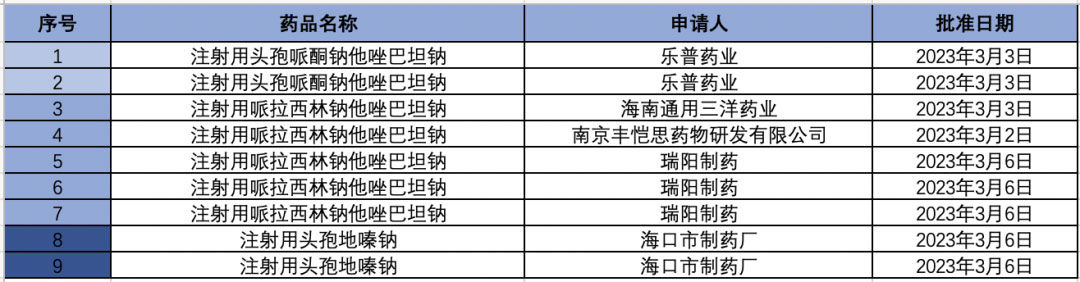 根据国家药监局官网3月2日至今日(3月16日)发布的多个药品批准证明文件送达信息,据赛柏蓝不完全统计,注射用头孢哌酮钠他唑巴坦钠新增过评企业为:乐普药业;注射用哌拉西林钠他唑巴坦钠新增过评企业分别为:海南通用三洋药业、南京丰恺思药物研发有限公司、瑞阳制药三家企业;注射用头孢地嗪钠新增过评企业:海口市制药厂。