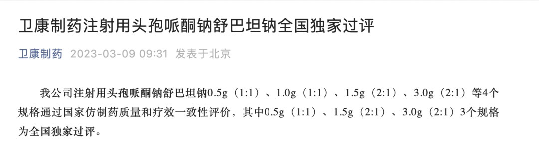 此外,海南卫康制药的注射用头孢哌酮钠舒巴坦钠也在近日全国独家过评,这里的全国独家过评为该品种的(2:1)剂型和0.5g的(1:1)剂型,其对比原研辉瑞,也就是说,之前业内分析的该产品的“1+11”竞争格局中,(2:1)剂型的目前只有卫康一家过评,对比原研辉瑞(2:1)剂型。