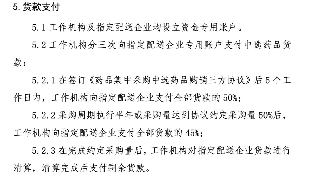 《补充文件》提到,质量检测方面,申报企业“必须接受中选药品一年至少两次的抽检和必要时进行飞检”;回款上,分三个时间段完成结算推进工作。