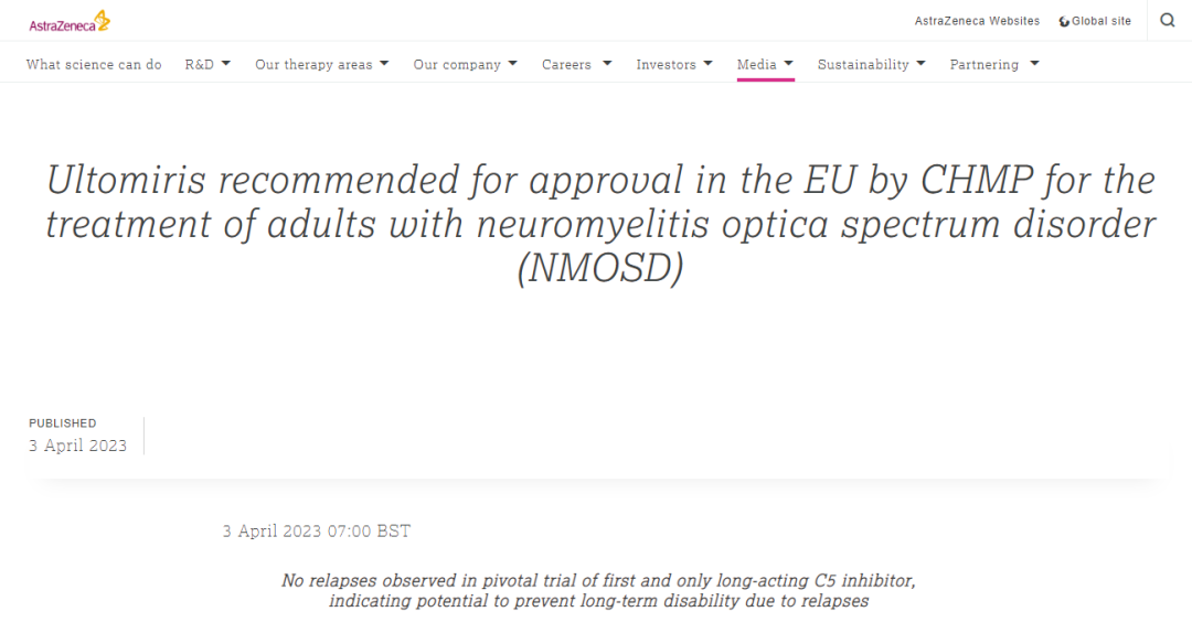 4 月 3 日,阿斯利康宣布,长效 C5 补体抑制剂 Ultomiris 治疗抗水通道蛋白 4(AQP4)抗体阳性(Ab+)视神经脊髓炎(NMOSD)的新适应症上市申请获 CHMP 推荐批准,离欧洲上市又近了一步。