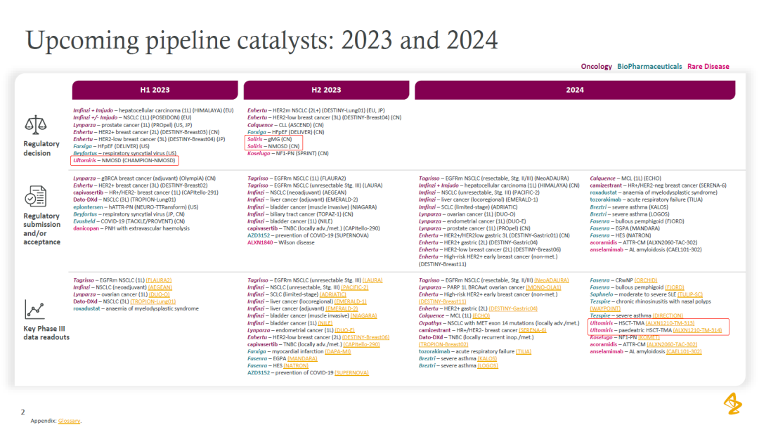 此前在年报中,阿斯利康预计,将在今年上半年取得 Ultomiris 治疗 NMOSD 的监管批准;下半年,Soliris 有两项适应症预计在中国有望获批;明年,Ultomiris 还有两项适应症将有关键临床数据读出。