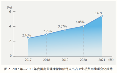 特别是随着互联网行业与保险行业的不断融合,借助互联网渠道,保障群众自负医疗费用的商业医疗保险蓬勃发展。部分地区也在积极探索发展城市定制型的商业医疗保险,将既往症人群和老年人群纳入了保障范围。2021年商业健康保险赔付支出占当年卫生总费用的比例达5.4%,较2017年提升了近3个百分点(见图2)。