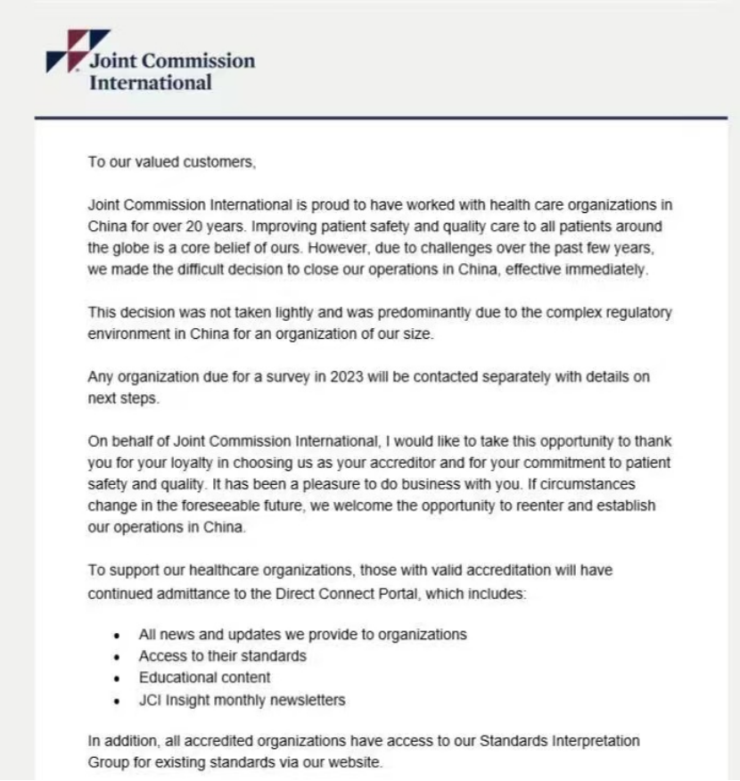 邮件的发起者国际医疗卫生机构认证联合委员会(JCI)给出的关闭理由是“中国复杂的监管环境”,同时也表示“这是一个艰难的决定,如果未来情况发生变化,希望有机会重新进入中国”。