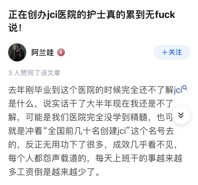 有医院内部职工吐槽,自己所在的医院“为了参评而参评”,突击式应对专家检查,评审过后一切照旧,对医院的管理提升实则有限。在他们眼里,JCI显然是个“劳民伤财”的大工程。