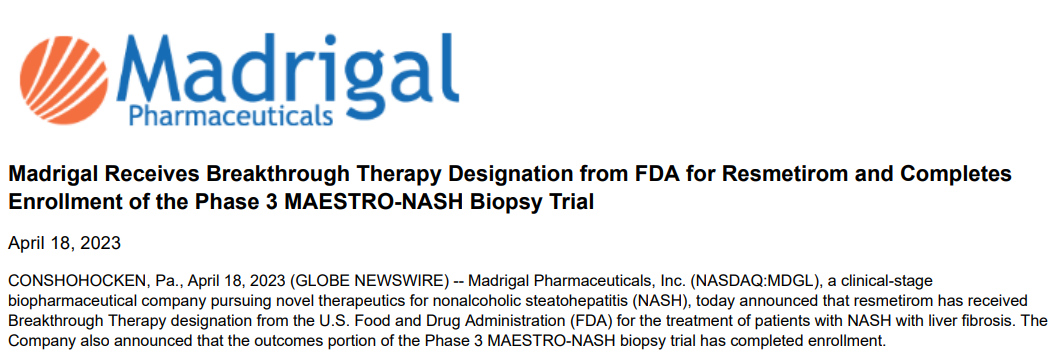 4月18日,Madrigal Pharmaceuticals宣布FDA授予resmetirom治疗伴有肝纤维化的非酒精性脂肪性肝炎 (NASH) 患者的突破性疗法认定。