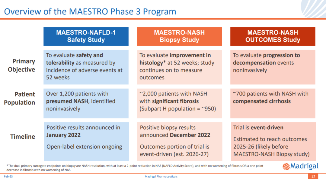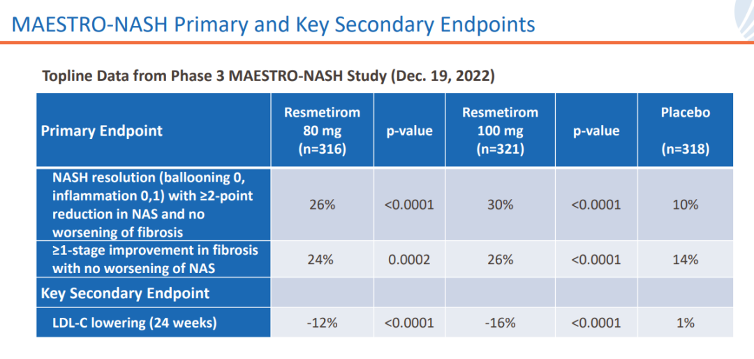 Madrigal表示,基于为期52周的MAESTRO-NASH研究、MAESTRO-NAFLD-1研究等积极数据,预计于2023年第二季度向FDA递交上市申请,以寻求加速批准。