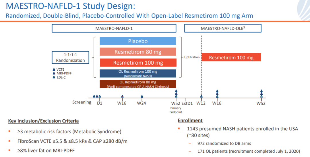 针对NAFLD患者的多中心、随机、安慰剂对照的III期MAESTRO-NAFLD-1研究已于2019年12月启动,患者按1:1:1:1分为四组,分别接受resmetirom 80mg或100mg、安慰剂(双盲)、resmetirom 100mg(开放标签),为期52周。该研究主要终点为安全性,关键次要终点包括LDL-C、载脂蛋白B(apoB)、甘油三酯(TG)、肝脏脂肪含量(MRI-PDFF)等指标的降低水平。