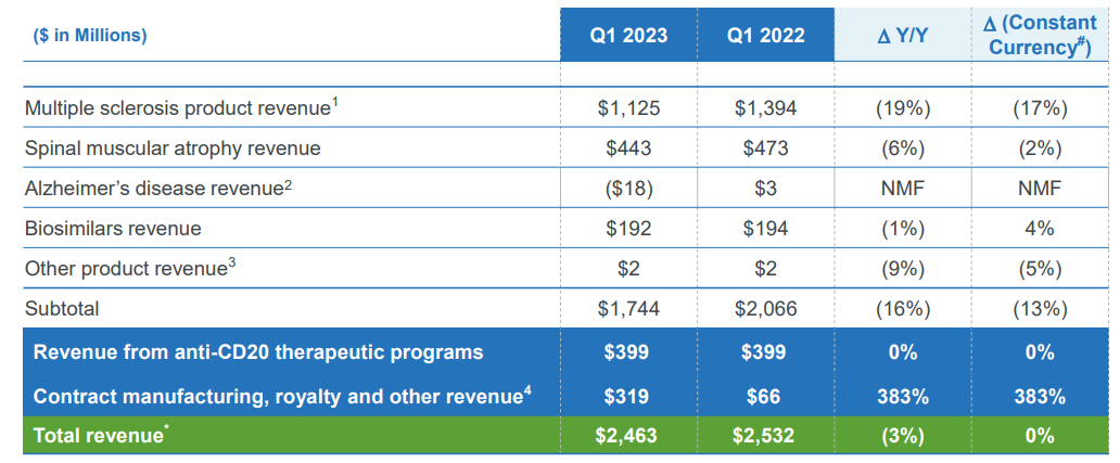 Biogen目前面临着两大问题:其多发性硬化症特许经营权的收入下降,2023年Q1同比下降19%,以及有较大争议的阿尔茨海默病药物Aduhelm,2023年Q1亏损0.18亿美元。