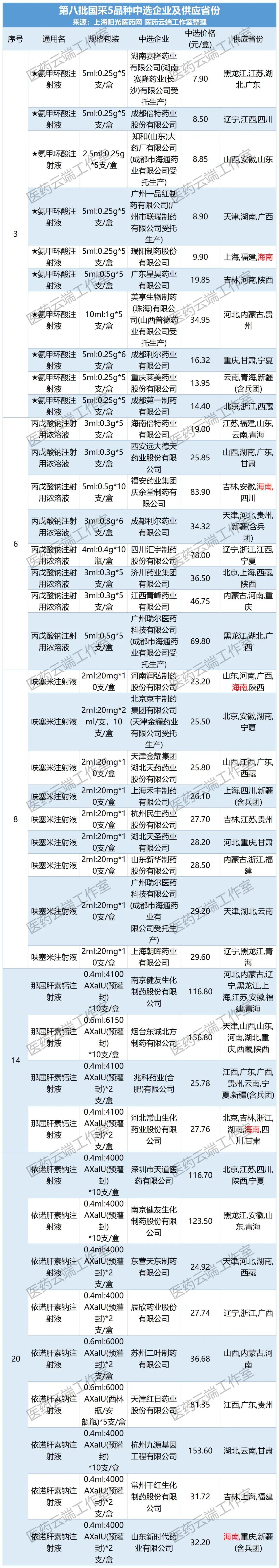 以同通用名最低询价结果确定上述5个品种的第二备供企业。当申报价格相同时,按国家中选排名顺序优先中选。以下是第八批集采5个品种中选企业及供应情况,供应海南的企业(已标红)不能作为第二备供企业;第一备供已选择海南的企业,同样不能作为海南的第二备供企业(本文省略此表)