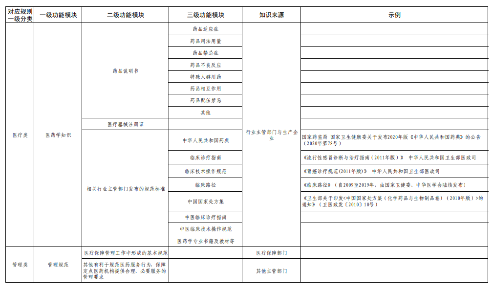 1.0版国家“两库”框架体系包括知识库框架、规则分类与释义、规则库框架等内容。知识库包括政策类、管理类、医疗类三类知识目录,包括法律法规和政策规范、医保信息业务编码、医药学知识、管理规范等内容。规则库包括79条规则。79条规则按一级分类,分为政策类(30条)、管理类(28条)、医疗类(21条)。按二级分类,政策类分为药品政策限定类(12条)、医疗服务项目政策限定类(15条)、医用耗材政策限定类(3条);管理类分为信息数据监管类(8条)、药品监管类-管理要求(4条)、医用耗材监管类-管理要求(1条)、行为主体监管类(7条)、统计指标监测类(8条);医疗类分为药品合理使用类(12条)、医疗服务项目合理使用类(6条)、医用耗材合理使用类(3条)。