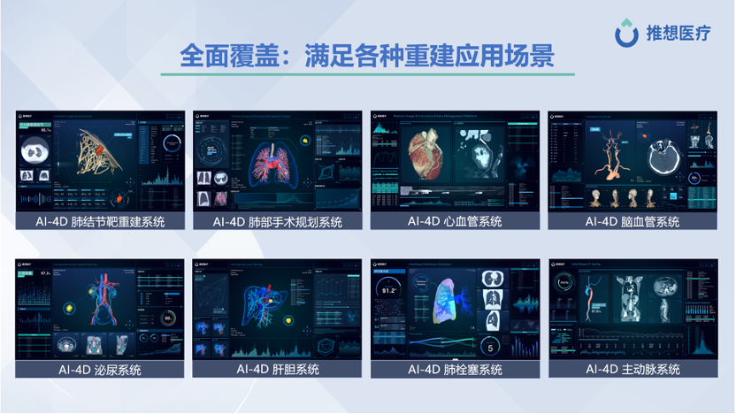 推想重磅发布了AI-4D平台,该平台包括一系列重建和结构化报告解决方案,运用深度学习和图像识别技术,将二维医学影像自动重建出立体的三维图像,便于医生快捷、精准地获取丰富多维的病灶及解剖信息,辅助医生回归精准诊断,提升影像科室价值。