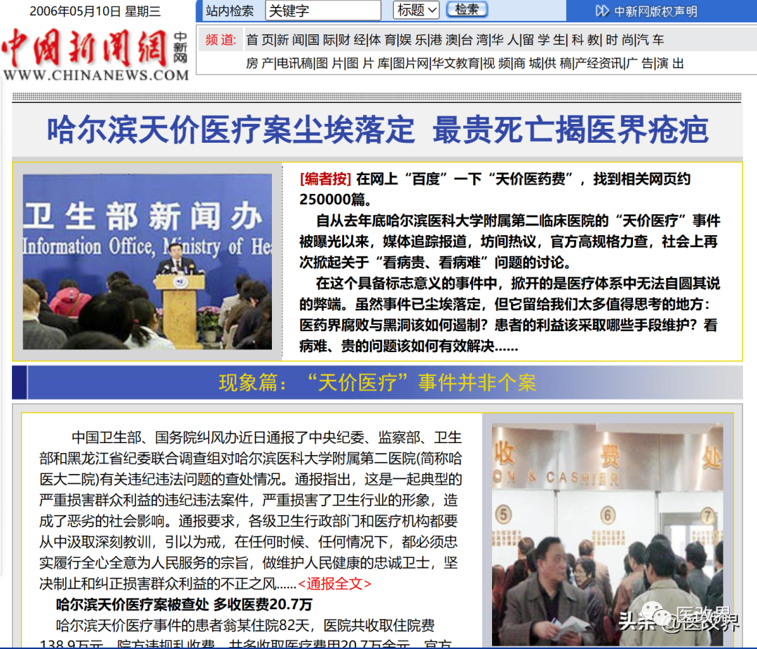 2005年哈尔滨出现“天价医疗案”后,从上到下不得不重新思考医改的方向和思路。面对这道世界性难题,2009年,新医改在争议中上路,同年3月颁发纲领性文件《中共中央、国务院关于深化医药卫生体制改革的意见》。