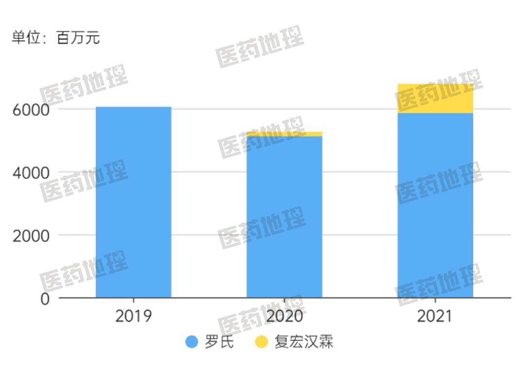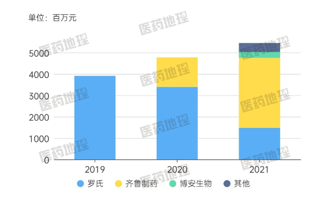 图2:贝伐珠单抗2019-2021主要销售额企业销售额变化 来源:Pharma one智能药物大数据分析平台