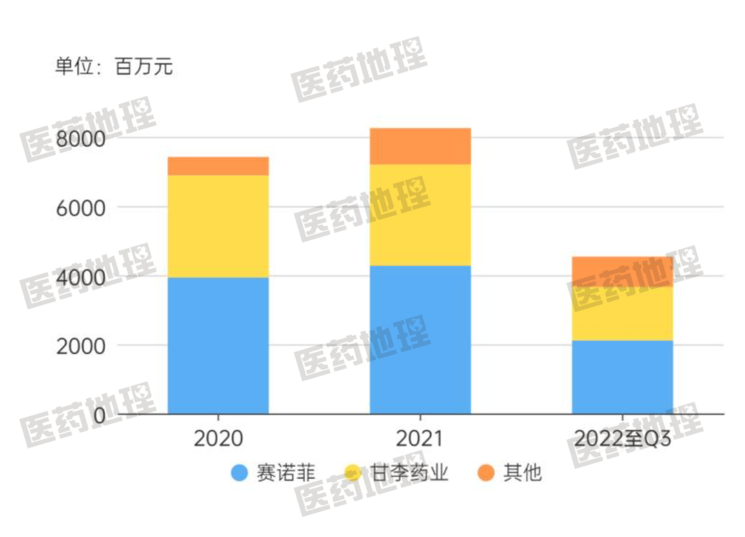 在2021年的市场变化中,由甘李药业中标甘精胰岛素而开启的市场洗牌反应强烈,赛诺菲的市场占比从2020年的52.99%一路下跌至46.66%,其中2022年至2021年的销售额更腰斩近一半(4275.35百万元下降至2116.31百万元)