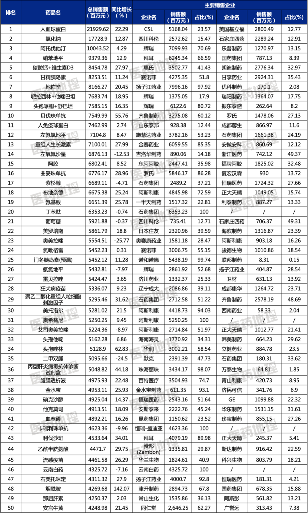 数据来源为Pharma one智能药物大数据分析平台中2020/2021/2022三年在中国市场所有品种的销售额统计,该数据库共收录4,2986家集团公司名称和8,3338类药物,数据截止2022年Q3,本文主要检索了2021年销售量排行前50的药品种类,数据库统计该年中国市场药品销售额为1492434.8百万人民币,排行前五十位的药品总销售额约为325,345.24百万人民币,占比达21%,一定程度上能一窥中国医药销售市场全貌。