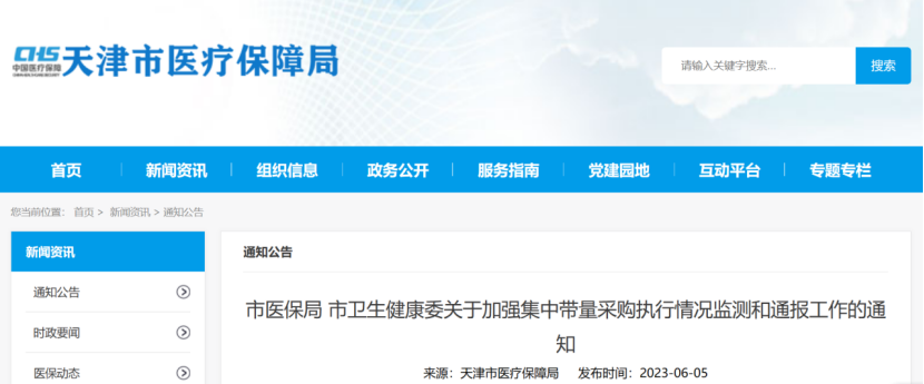 近日,天津市医保局、天津市卫健委发布《关于加强集中带量采购执行情况监测和通报工作的通知》(以下简称《通知》),其中明确,进一步强化药品和医用耗材集中带量采购执行情况监测和通报。