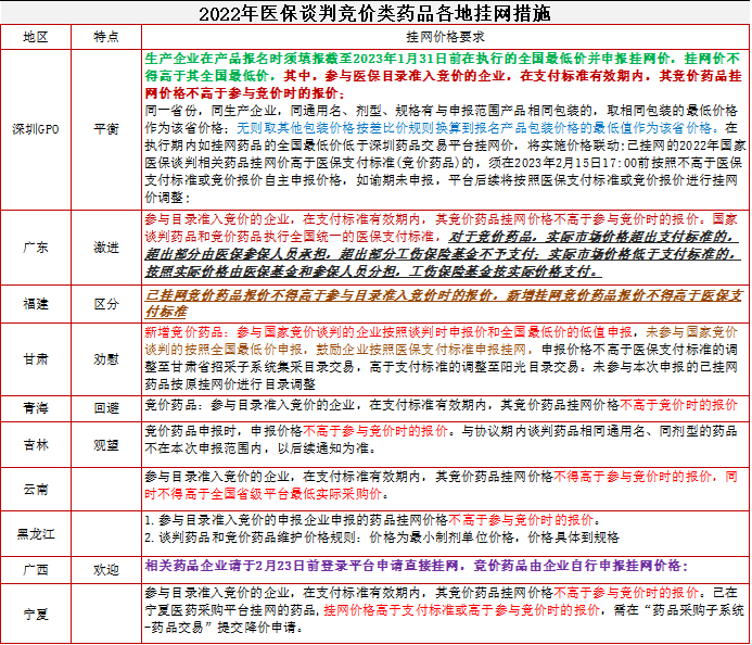 竞价成功的最直观感受是价格。价格如何意味着空间如何,价格如何意味着无论是代理还是自营都可以自由切换,价格如何意味着这个品种的生命周期最核心的核心能撑多久。但理想中的价格是一个价格全国挂网,但不同省份有着不同规则,以下表为例,率先上场降价的不一定能笑到最后,没有上场的还有可能维价成功,这种事情已经不是新鲜事,但在新一轮国谈即将到来的时候,如何把价格问题尤其是各省的价格挂网事宜规范到位,是很关键的。