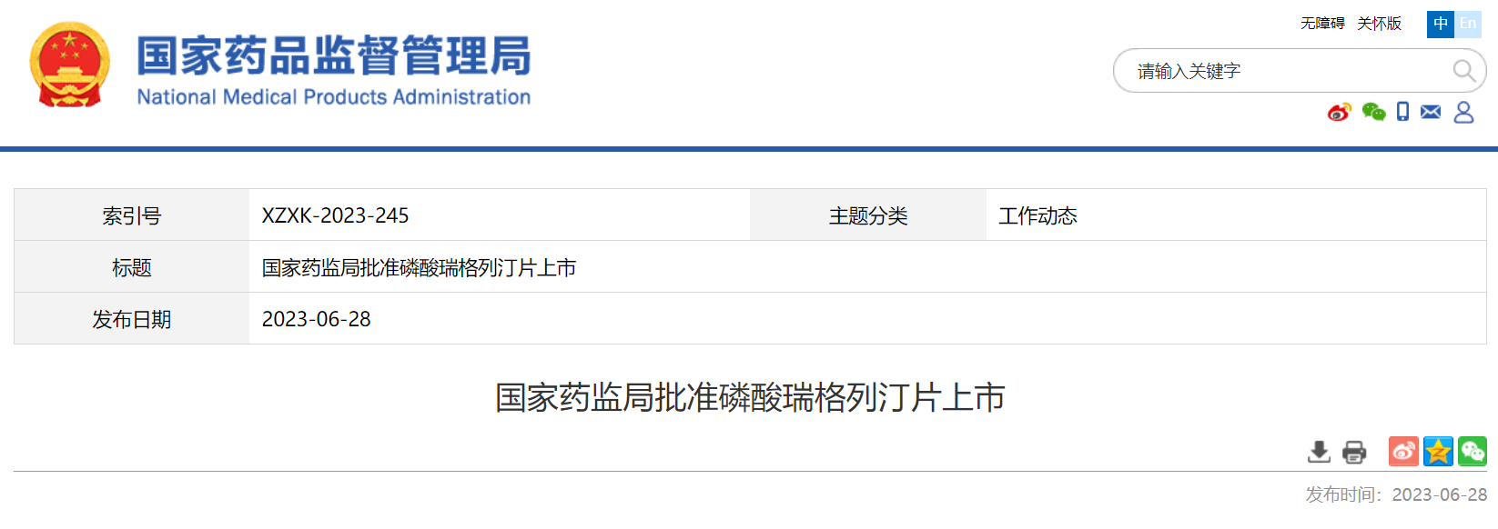 近日,国家药品监督管理局批准江苏恒瑞医药股份有限公司申报的1类创新药磷酸瑞格列汀片(商品名:瑞泽唐)上市,该药适用于改善成人2型糖尿病患者的血糖控制。