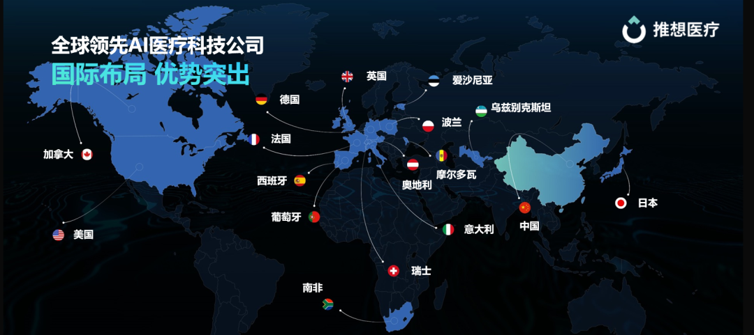 推想医疗始终是中国AI医疗企业国际化的主力军,自2018年陆续成立推想日本、北美、欧洲团队,其产品在国际上广获赞誉。更重要的是,推想是为数不多在海外拥有业务团队并真正开展国际合作的AI医疗企业,在产品注册、海外商业化、国际标准制定等方面不断有新的进展和好消息。