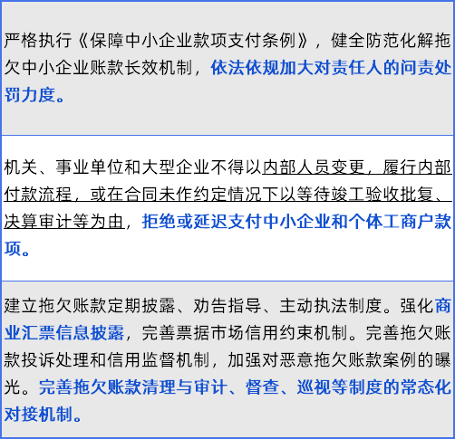 《意见》还明确完善拖欠账款常态化预防和清理机制。不仅要对公立医院等事业单位、机关拖欠货款,建立负责人问责制,还要完善拖欠账款相关投诉及信用机制,全面加强针对拖欠中小企业货款等问题的曝光、巡查、审计常态化监管机制。