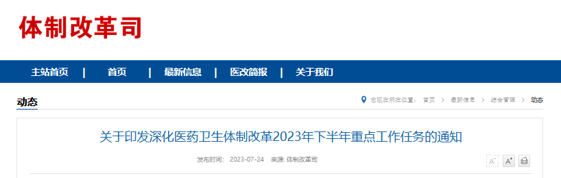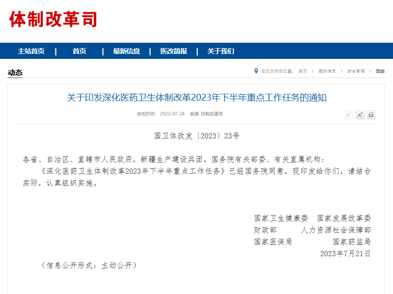 7月24日,国家卫健委、国家发改委、财政部、人力资源社会保障部、国家医保局、国家药监局联合发布《关于印发深化医药卫生体制改革2023年下半年重点工作任务的通知》(以下简称《通知》)。