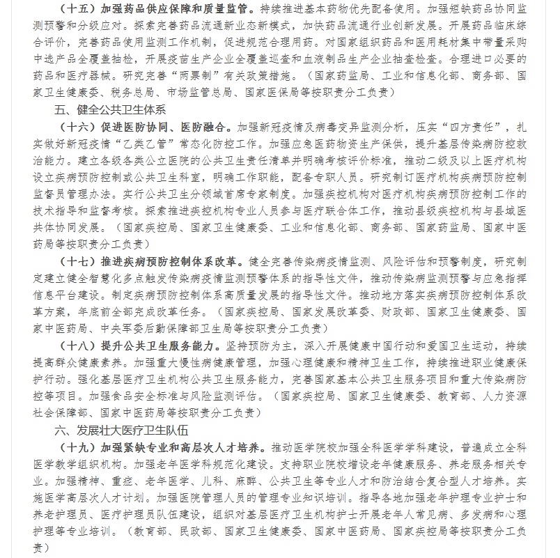 具体包括:推进国家医学中心和国家区域医疗中心设置建设;持续提升地市和县级医疗水平;加强社区和农村医疗卫生服务能力建设;完善促进分级诊疗的体制机制;促进中医药传承创新发展。
