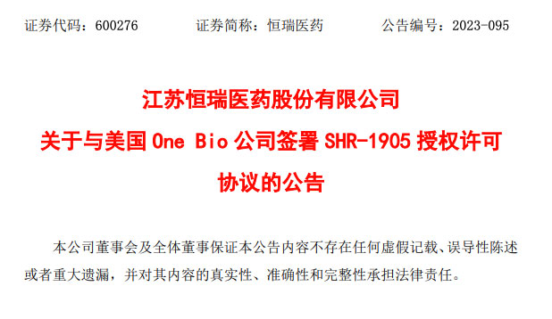 根据协议条款,One Bio 将获得 SHR-1905 项目在除大中华区以外的全球范围内开发、生产和商业化 SHR-1905 的独家权利。