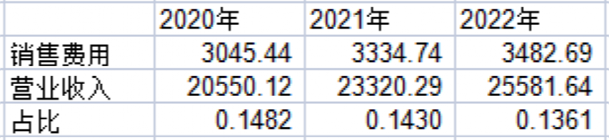 2020年至2022年,A股医药生物公司销售费用占营业收入的比例分别为14.82%、14.3%、13.61%。