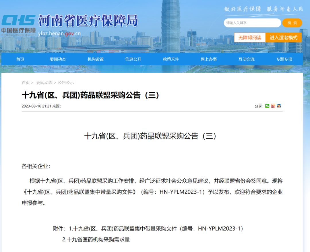 2023年8月16日,根据《十九省(区、兵团)药品联盟集中带量采购文件》(编号:HN-YPLM2023-1),河南、山西、内蒙古、辽宁、吉林、黑龙江、安徽、江西、湖南、广西、海南、贵州、云南、西藏、陕西、青海、宁夏、新疆、新疆生产建设兵团等十九省(区、兵团)组成省际联盟,开展药品集中带量采购工作。本次集采将于8月22日正式报价,8月29日开展议价谈判。