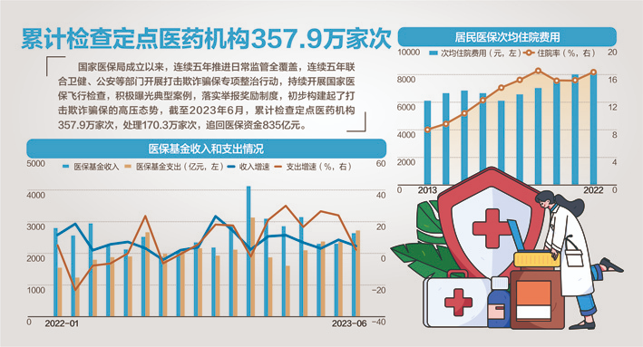国家医保局成立以来,连续五年推进日常监管全覆盖,连续五年联合卫健、公安等部门开展打击欺诈骗保专项整治行动,持续开展国家医保飞行检查,积极曝光典型案例,落实举报奖励制度,初步构建起了打击欺诈骗保的高压态势。据统计,截至2023年6月,累计检查定点医药机构357.9万家次,处理170.3万家次,追回医保资金835亿元。