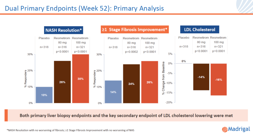▲Resmetirom在关键性3期临床试验中的主要终点数据(图片来源:Madrigal公司官网)