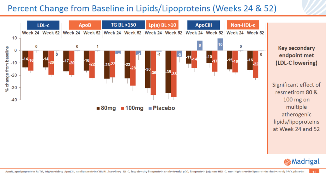 ▲Resmetirom降低多种脂质和脂蛋白指标(图片来源:Madrigal公司官网)