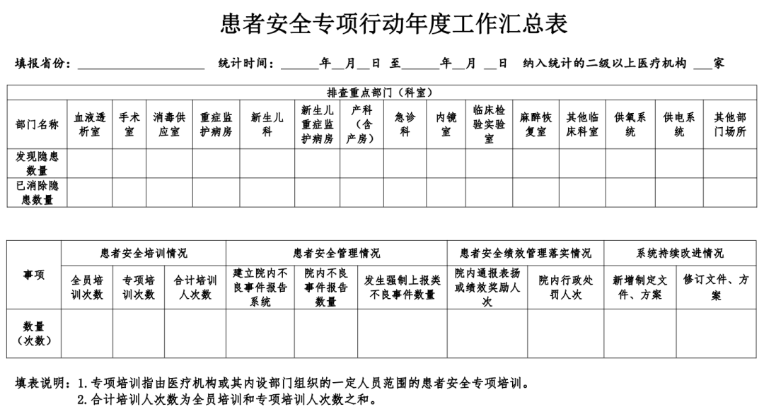 各省级卫生健康行政部门于每年10月30日前将本年度患者安全工作汇总表报送国家卫生健康委医政司。