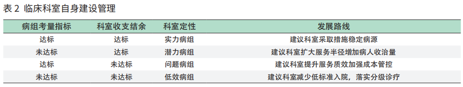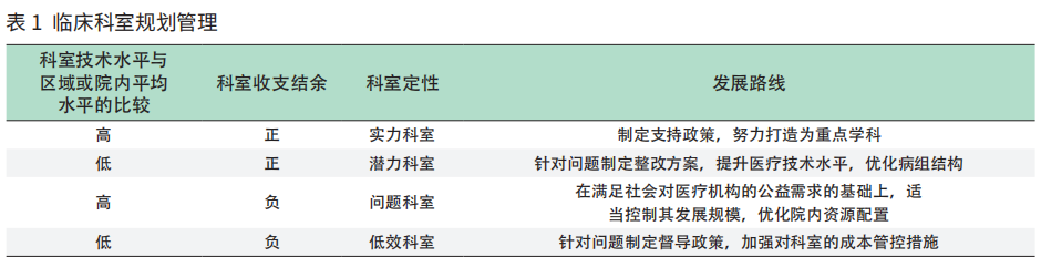 在医院对临床科室的规划管理上,通过DRG的六大核心指标(病例组合指数、DRG组、总权重、时间消耗指数、费用消耗指数、低风险组死亡率),结合科室收支情况,定期评价各科室在区域内或院内技术水平,并制定评价周期和管理周期,对期内评价结果相对稳定的科室定性分类,并根据其分类规划不同的发展路线(见表1)。