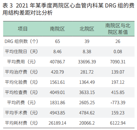在职能科室对临床科室的监督管理中,通过大数据比对可以让职能科室通过指标变化更方便、直观地监测临床科室存在的问题,履行监督与服务的职能。同时,也能够让临床科室主动查找问题,改变被动接受的习惯,关注指标变化背后科室存在的实质问题。2021年,在对某季度的DRG数据比对中发现,两院区心血管内科“经皮心血管操作及冠状动脉药物洗脱支架植入,伴重要或合并症与伴随病”DRG组的费用结构差异较大,特别是南院区的平均耗材费用远高于北院区(见表3)。经设备科核查后发现,南北院区两科室使用的耗材不同质,基于此项问题,医院出台了新的高值耗材管理办法,促进了两院区诊疗的同质化,提升了医院的精细化管理水平。