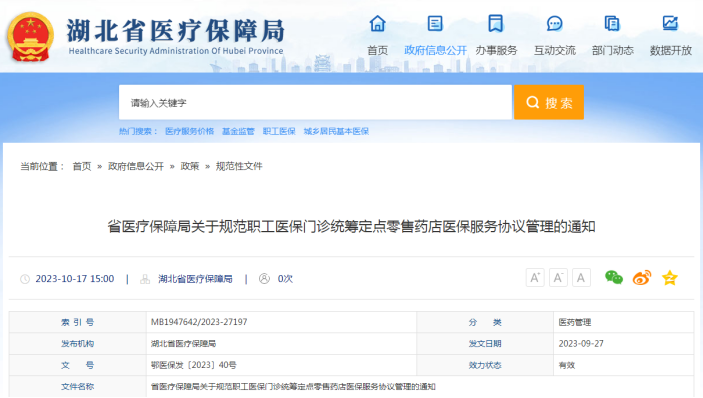 日前,湖北省医疗保障局官方网站发布《关于规范职工医保门诊统筹定点零售药店医保服务协议管理的通知》(简称《通知》),明确了开通定点零售药店职工医保门诊统筹服务的条件,并规定了医保目录内药品品种占零售药店药品配备比例不低于60%(不含中药饮片)。