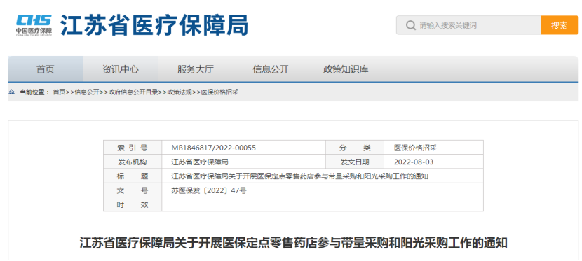 2022年8月3日,江苏医保局发布《关于开展医保定点零售药店参与带量采购和阳光采购工作的通知》,要求:对省平台挂网的带量采购中选药品,医保定点药店要按挂网价格采购并按采购价格“零差率”销售。这也就意味着,医保定点零售药店将与公立医院一样,集采药品实现同一种价格销售。