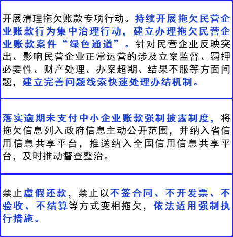 其中明确出台包括:加大拖欠账款专项清理;纳入失信惩戒;建立拖欠账款案件“绿色通道”,快速受理办结;强制执行拖欠账款等系列措施。