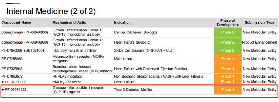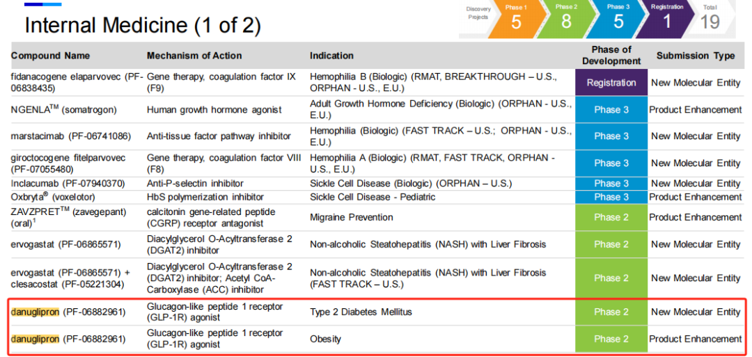除了PF-06954522,辉瑞还有一款GLP-1R小分子danuglipron处于II期临床,适应症为降糖、减重。