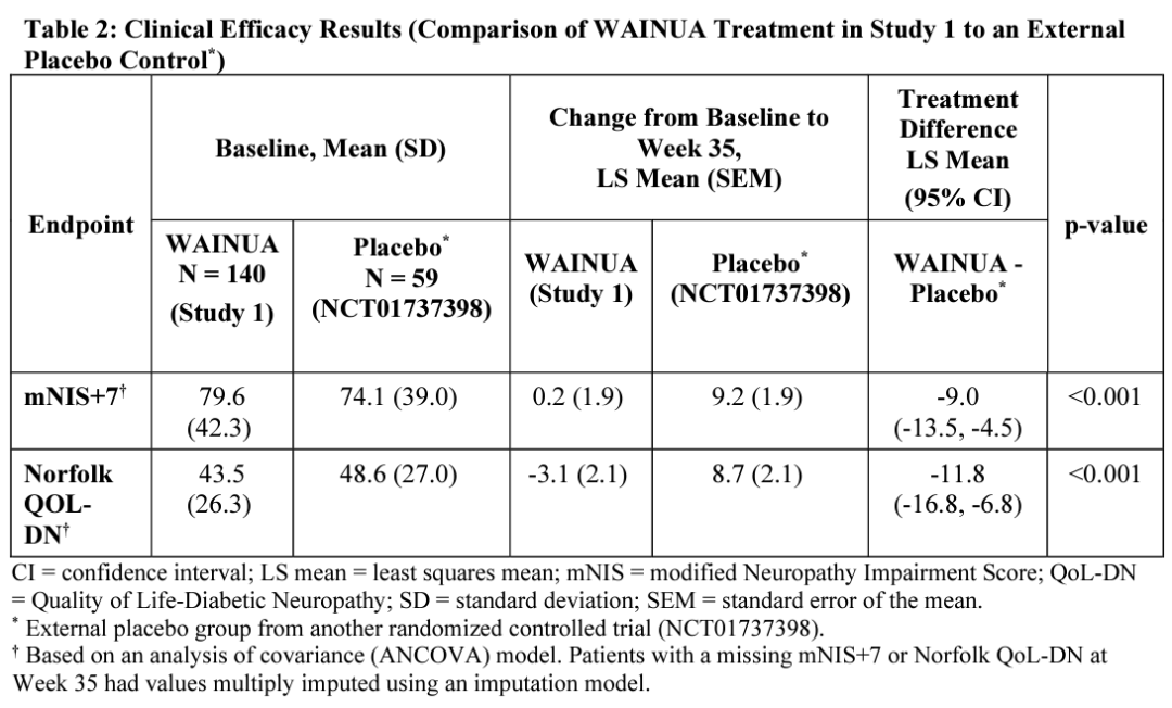 根据Wainua获批标签显示,一项在ATTRv-PN成人患者中开展的随机、开放标签、多中心的临床3期试验证明了Wainua的疗效。分析显示,在接受治疗35周时,与外部安慰剂对照相比,Wainua治疗导致患者在改良神经病损伤评分+7(mNIS+7)和生活质量指标(Norfolk QoL-DN)总分上出现统计学显著改善(p<0.001)。